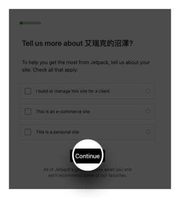 五、接著它會有個安裝引導,我們就跟著做就會完成設定。首先他會問我們網站的用途,選好後,點選 Continue 即可。