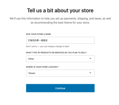 四、接著,我們要來填入些基本資料這裡主要是商家名稱、產業別、商店位置。也是一樣,填寫好了後,我們按 Continue 。