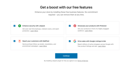 五,這個步驟會有一些 WooCommerce 推薦的整合工具。勾選想要強化的功能後,我們按 Continue ,這樣就完成安裝了。