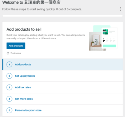 一、接著會進入使用引導的畫面。我們依序要設定第一個商品、付款方式、稅率、以及行銷和客製化商店。那我們按照他的五個步驟,依照順序完成。
