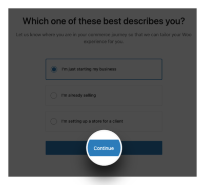 三、WooCommerce 會想要知道我們用 WooCommerce 的用途。那我們應該都是想開始我們的生意,所以勾選 I’m just starting my business 後,點選 Continue 。